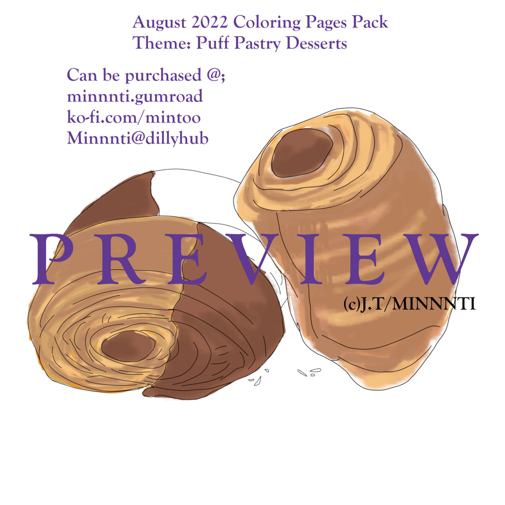 This is my fifteenth coloring pages pack, made for August(2022). The theme is puff pastry desserts. Illustration pages contained in this pack are; croissants, cronuts, fruit puff tarts, mille feuille and pinwheel swirl puffs.