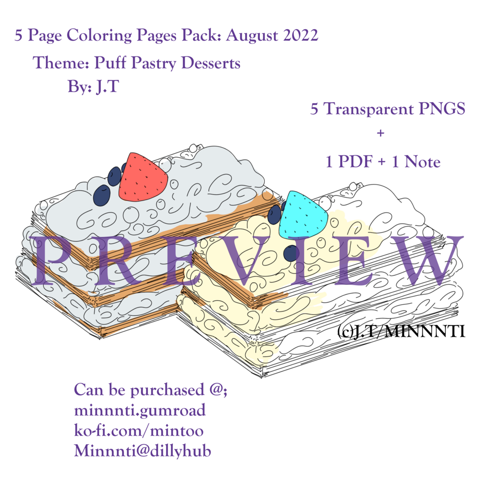 This is my fifteenth coloring pages pack, made for August(2022). The theme is puff pastry desserts. Illustration pages contained in this pack are; croissants, cronuts, fruit puff tarts, mille feuille and pinwheel swirl puffs.