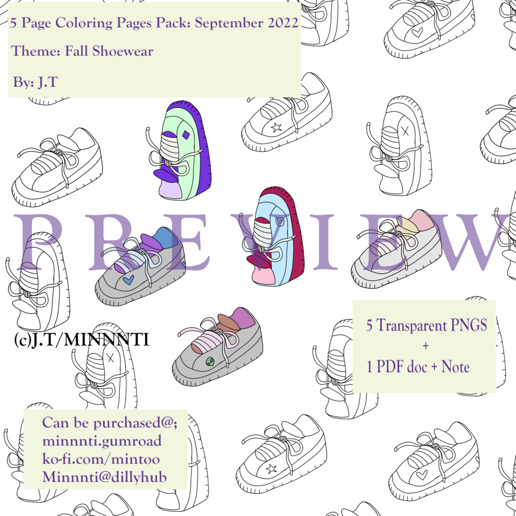 This is my sixteenth coloring pages pack, made for September(2022). The theme is fall shoe-wear/footwear. Illustration pages contained in this pack are; ankle boots, ballet flats, knee-high boots, pumps and sneakers.